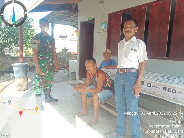 Batu Bara | Aktivitas masyarakat di pasar tradisional menjadi perhatian dari tim gabungan satgas penanganan Covid-19 di daerah, dengan melaksanakan patroli disiplin mandiri covid 19 dipasar delima indrapura menghimbau kepada pedagang dan pembeli agar tetap menggunakan masker dan menjaga jarak serta tidak lupa mencuci tangan guna memutuskan penyebaran Covid-19. Seperti halnya yang dilakukan oleh Personel Bintara Pembina Desa (Babinsa) Koramil 04/Talawi jajaran Kodim 0208/Asahan Koptu Sambari turun kewilayah binaan untuk melaksanakan kegiatan Komunikasi Sosial (Komsos) dengan dengan masyarakat menghimbau agar selalu menjaga protokol kesehatan dan melaksanakan Vaksinasi sekaligus menghimbau agar selalu mencuci tangan dengan sabun, menggunakan masker dan menjaga jarak serta menghindari kerumunan guna mencegah penularan Covid-19. Kegiatan tersebut yang dilaksanakan bertempat di Dusun 1 Desa Mekar Baru Kecamatan Datuk Tanah Datar Kabupaten Batu Bara, Minggu (03/04/2022).