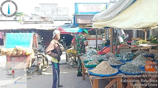 Batu Bara  |  Aktivitas masyarakat di pasar tradisional menjadi perhatian dari tim gabungan satgas penanganan Covid-19 di daerah. Seperti halnya yang dilakukan oleh Personel Bintara Pembina Desa (Babinsa) Koramil 02/Air Putih jajaran Kodim 0208/Asahan Serda Yustinus Jai dan Serda A. Silaban, melaksanakan Pam Disiplin Mandiri Covid-19 di Pasar Delima Indrapura dengan menghimbau kepada para pedagang dan pembeli agar selalu mencuci tangan dengan sabun, menggunakan masker dan menjaga jarak serta menghindari kerumunan guna mencegah penularan Covid-19. Kegiatan tersebut bertempat di Pasar Delima, Kelurahan Indrapura, Kecamatan Air Putih, Kabupaten Batubara, Sabtu (30/04/2022).