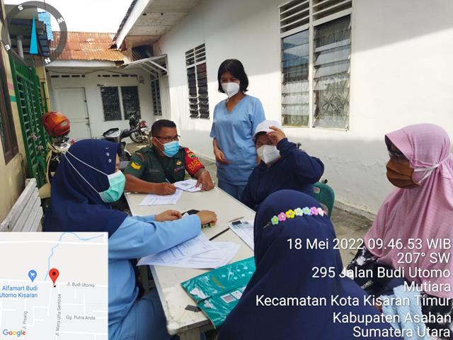 Asahan  |  Kegiatan para Babinsa tersebut bertujuan untuk memastikan kelancaran dan ketertiban pelaksanaan vaksinasi bagi masyarakat, serta mendukung program Pemerintah dalam Serbuan Vaksinasi untuk membentuk kekebalan kelompok atau Herd Immunity, dalam hal ini seperti yang dilakukan oleh Personel Pembina Desa (Babinsa) Koramil 06/Kisaran jajaran Kodim 0208/Asahan Serka Syafriman turun kewilayah binaan untuk melaksanakan kegiatan Pendampingan Vaksinasi Covid-19 kepada masyarakat binaan, bersama dengan Ketua Tim Nakes dr. Khairul, Nakes dari Puskesmas Mutiara dan Pasien Vaksinasi, kegiatan tersebut yang dilaksanakan bertempat di Kantor Lurah Mutiara Jalan Budi Utomo Lingkungan I Kelurahan Mutiara Kecamatan Kisaran Timur Kabupaten Asahan, Rabu (18/05/2022).