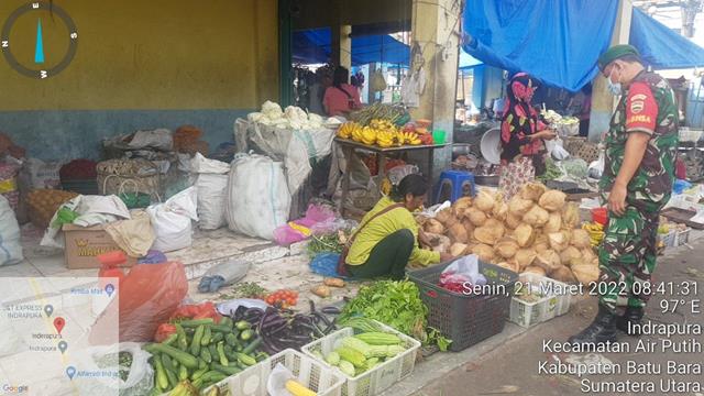 Batu Bara | Agar masyarakat selalu mengikuti Protokoler Kesehatan yang telah ditetapkan oleh Pemerintah guna mencegah penyebaran virus Covid-19, dalam hal ini seperti yang dilakukan oleh Personel Bintara Pembina Desa (Babinsa) Koramil 02/Air Putih jajaran Kodim 0208/Asahan Sertu Risman dan Serda Supriadi turut serta melaksanakan kegiatan Pengamanan Disiplin Mandiri Covid 19 di Pasar Delima Indrapura dengan menghimbau kepada para pedagang dan konsumen agar selalu menggunakan masker dan menjaga jarak serta mencuci tangan dgn sabun guna menghindari penularan Covid-19, kegiatan tersebut yang dilaksanakan bertempat di Pajak Delima Indrapura Kelurahan Indrapura Kecamatan Air Putih Kabupaten Batu Bara, Senin (21/03/2022).