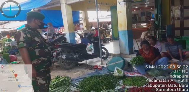 Batu Bara  |  Dalam rangka untuk memutus mata rantai penyebaran covid-19 diwilayah binaan salah satunya ditempat keramaian (Pasar Tradisional), dalam hal ini Para pedagang dan pembeli merasa senang dengan adanya himbauan dari Babinsa, seperti yang dilaukan oleh Personel Bintara Pembina Desa (Babinsa) Koramil 02/Air Putih jajaran Kodim 0208/Asahan Sertu Raja Gukguk dan Serda A. Tumanggor turun kewilayah binaan untuk melaksanakan Pam Disiplin Mandiri Covid-19 di Pasar Delima Indrapura dengan menghimbau kepada para pedagang dan pembeli agar selalu mencuci tangan dgn sabun, menggunakan masker dan menjaga jarak serta menghindari kerumunan guna mencegah penularan Covid-19, kegiatan tersebut yang dilaksanakan bertempat di Pasar Delima Kelurahan Indrapura Kecamatan Air Putih Kabupaten Batu Bara, Kamis (05/05/2022).