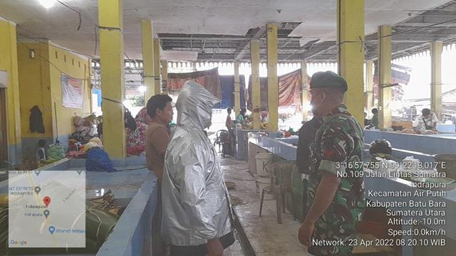 Batu Bara | Dalam rangka untuk memutus mata rantai penyebaran covid-19 diwilayah binaan salah satunya ditempat keramaian (Pasar Tradisional), dalam hal ini Para pedagang dan pembeli merasa senang dengan adanya himbauan dari Babinsa, seperti yang dilaukan oleh Personel Bintara Pembina Desa (Babinsa) Koramil 02/Air Putih jajaran Kodim 0208/Asahan Serda Anwar Sadat dan Koptu Irpan Sinaga turun kewilayah binaan untuk melaksanakan Pam Disiplin Mandiri Covid-19 di Pasar Delima Indrapura dengan menghimbau kepada para pedagang dan pembeli agar selalu mencuci tangan dgn sabun, menggunakan masker dan menjaga jarak serta menghindari kerumunan guna mencegah penularan Covid-19, kegiatan tersebut yang dilaksanakan bertempat di Pasar Delima Kelurahan Indrapura Kecamatan Air Putih Kabupaten Batu Bara, Sabtu (23/04/2022).