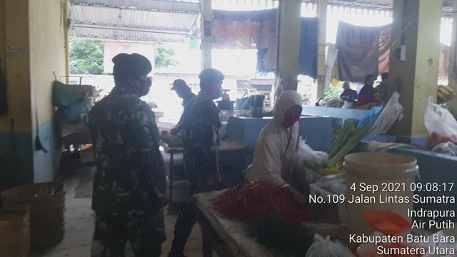 Batu Bara | Para pedagang dan pembeli merasa senang dengan adanya himbauan dari Babinsa, dalam hal ini Personel Bintara Pembina Desa (Babinsa) Koramil 02/Air Putih jajaran Kodim 0208/Asahan Serka AL. Samosir dan Serda A. Tumanggor turun kewilayah binaan untuk melaksanakan Pam Disiplin Mandiri Covid-19 di Pasar Delima Indrapura dengan menghimbau kepada para pedagang dan pembeli agar selalu mencuci tangan dgn sabun, menggunakan masker dan menjaga jarak serta menghindari kerumunan guna mencegah penularan Covid-19, kegiatan tersebut yang dilaksanakan bertempat di Pasar Delima Kelurahan Indrapura Kecamatan Air Putih Kabupaten Batu Bara, Sabtu (04/09/2021).