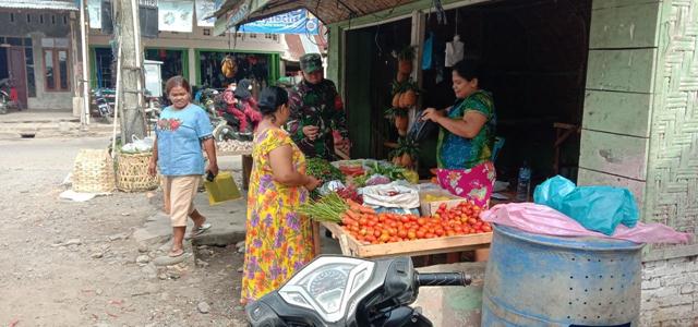 Pada kegiatan itu Babinsa Sertu T Purba juga membagikan masker secara gratis kepada masyarakat yang berapa di Pekan yang lagi asik berbelanja tanpa pakai masker.