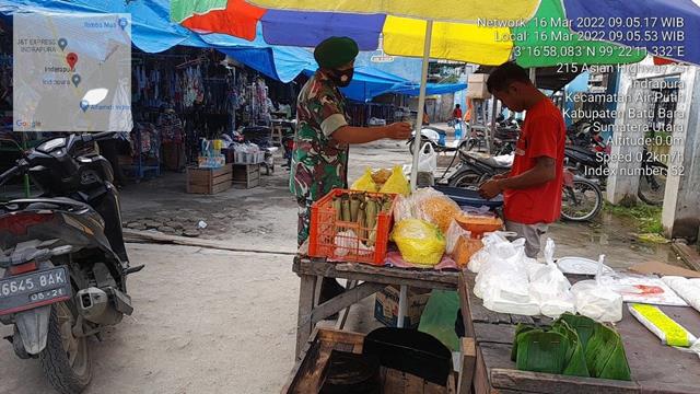 Batu Bara | Melaksanakan pengamanan disiplin mandiri covid 19 dipasar delima indrapura. Menghimbau kepada pedagang dan pembeli agar tetap menggunakan masker dan menjaga jarak dan tidak lupa mencuci tangan guna memutuskan penyebaran covid 19, seperti halnya yang dilakukan oleh Personel Bintara Pembina Desa (Babinsa) Koramil 02/Air Putih jaajran Kodim 0208/Asahan Sertu Risman dan Koptu Irpan Sinaga turun kewilayah binaan untuk melaksanakan kegiatan Pengamanan Disiplin Mandiri Covid-19 di Pasar Delima Indrapura, kegiatan tersebut yang dilaksanakan bertempat di Pasar Delima Kelurahan Indrapura Kecamatan Air Putih Kabupaten Batu Bara, Rabu (16/03/2022).