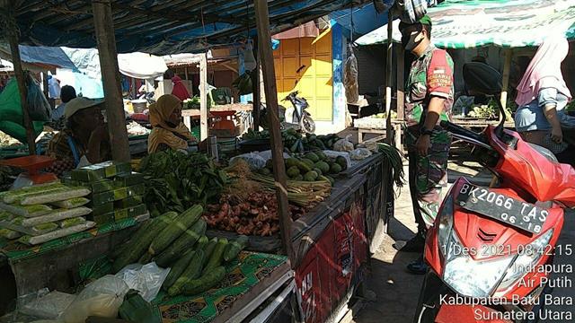 Batu Bara | Melaksanakan pengamanan disiplin mandiri covid 19 dipasar delima indrapura. Menghimbau kepada pedagang dan pembeli agar tetap menggunakan masker dan menjaga jarak dan tidak lupa mencuci tangan guna memutuskan penyebaran covid 19, seperti halnya yang dilakukan oleh Personel Bintara Pembina Desa (Babinsa) Koramil 02/Air Putih jaajran Kodim 0208/Asahan Sertu David dan Serda Supriadi turun kewilayah binaan untuk melaksanakan kegiatan Pengamanan Disiplin Mandiri Covid-19 di Pasar Delima Indrapura, kegiatan tersebut yang dilaksanakan bertempat di Pasar Delima Kelurahan Indrapura Kecamatan Air Putih Kabupaten Batu Bara, Rabu (01/12/2021).