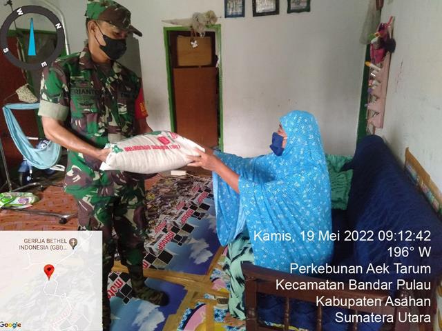 Asahan  |  Bantuan sembako yang disalurkan dapat bermanfaat bagi warga masyarakat yang menerima dan bagi masyarakat juga dihimbau tetap mematuhi protokol kesehatan seperti keluar rumah wajib mengenakan masker, selalu mencuci tangan dengan sabun diair yang mengalir dan jaga jarak aman, dalam hal ini seperti yang dilakukan oleh Personel Bintara Pembina Desa (Babinsa) Koramil 15/Bandar Pulau jajaran Kodim 0208/Asahan Serda Erianto turun kewilayahbinaan untuk melaksanakan kegiatan Komunikasi Sosial (Komsos) serta dengan memberikan bantuan berupa beras khususnya kepada warga kurang mampu bantuan ini sekedar meringankan beban masyarakat Serta Mempererat hubungan baik antara masyarakat dengan TNI, bersama dengan Ibu Sri Wahyuni Umur 56 Tahun dan Bapak Andre (Kadus II Desa Aek Tarum), kegiatan tersebut yang dilaksanakan bertempat di Desa Aek Tarum Dusun II Kecamatan Bandar Pulau  Kabupaten Asahan, Kamis (19/05/2022).