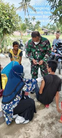Batu Bara | Dalam rangka percepatan penanganan Covid-19 serta pemerataan vaksinasi di wilayah Kabupaten Batu Bara, seperti halnya yang dilakukan Personel Bintara Pembina Desa (Babinsa) Koramil 01/Medang Deras jajaran Kodim 0208/Asahan Peltu Hendry S, laksanakan serbuan vaksinasi covid-19 secara door to door dan membuka gerai vaksinasi dengan giat Vaksinasi Dor to Dor Mendampingi Bidan Desa dan mengajak warga yg belum melaksanakan Vaksinasi agar segera Vaksinasi guna terhindar dari virus Covid-19 bersama Ibu Tiurma (Bides), Ibu Romauli dan Bapak James, kegiatan tersebut yang dilaksanakan bertempat di Desa Cengkring Kecamatan Medang Deras Kabupaten Batu Bara, Rabu (12/01/2022).