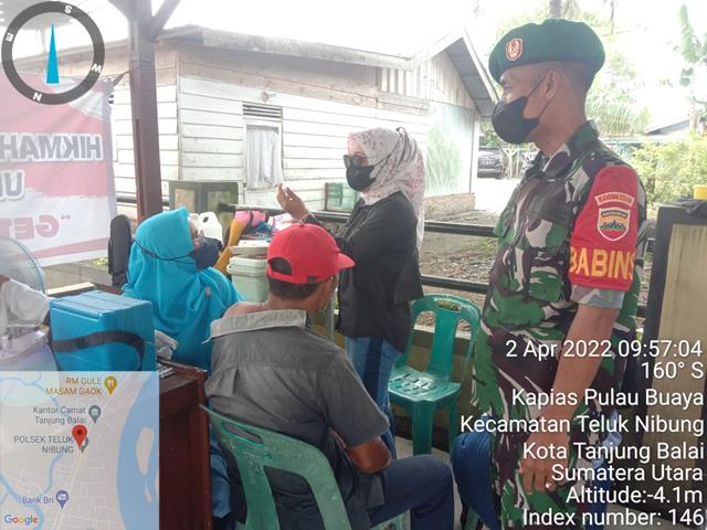 Simalungun | Pelaksanaan Vaksinasi kepada warga Masyarakat diwilayah desa binaan turut serta didampingi oleh Personel Bintara Pembina Desa (Babinsa) Koramil 08/Pulau Buaya jajaran Kodim 0208/Asahan Sertu Ahmadi serta rekannya turun kewilayah binaan untuk turut serta melaksanakan kegiatan pendampingan Suntik Vaksinasi Dosis I, ll Dan Booster kepada warga Masayarakat diwilayah binaan agar warga masyarakat terhindar dari Covid-19 dan tetap mematuhi Protokol Kesehatan dalam melakukan aktivitas di luar rumah bersama dengan Aiptu Budi (Babinkamtibmas), Tim Vaksinator dan Bapak Suwandi (Pasien Vaksin), kegiatan tersebut yang dilaksanakan bertempat di Kantor Polsek Teluk Nibung Kel.Kapias Pulau Buaya Kec.Teluk Nibung Kota Tanjungbalai, Sabtu (02/04/2022).