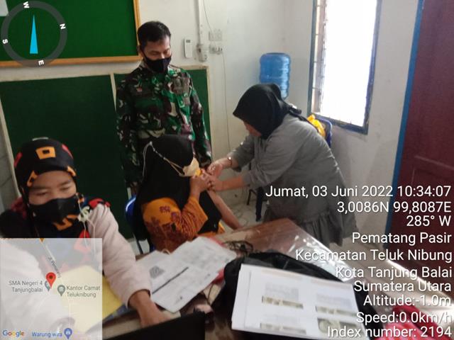Tanjung Balai  |  Pelaksanaan Vaksinasi kepada warga Masyarakat diwilayah desa binaan turut serta didampingi oleh Personel Bintara Pembina Desa (Babinsa) Koramil 08/Pulau Buaya jajaran Kodim  0208/Asahan Serma Subandi turun kewilayah binaan untuk turut serta melaksanakan pendampingan Nakes Puskesmas untuk pelayanan vaksin bagi masyarakat agar tetap terhindar dari virus covid 19 dan juga selalu mentaati prokes, bersama dengan Ibu Juraida S (Nakes), Ibu Rina (Nakes) dan Ibu Cece (Nakes), kegiatan tersebut yang dilaksanakan bertempat di Puskesmas Pematang Pasir Kecamatan Teluk Nibung Kota Tanjung Balai, Jumat (03/06/2022).