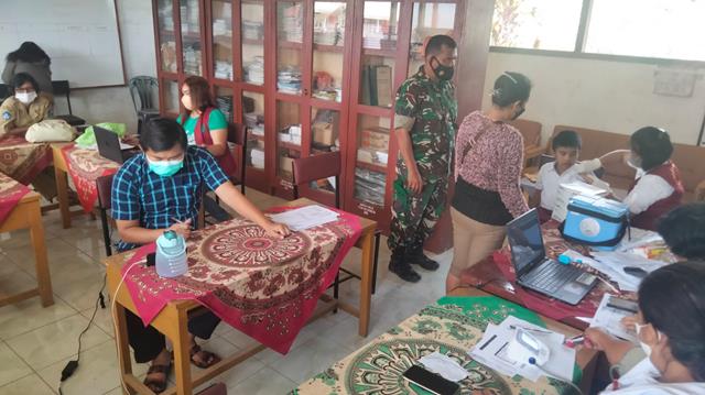Simalungun | Pelaksanaan Vaksinasi kepada warga Masyarakat diwilayah desa binaan, dalam hal ini Personel Bintara Pembina Desa (Babinsa) anggota Koramil 09/Tiga Balata jajaran Kodim 0207/Simalungun Serma Poltak Pakpahan turun kewilayah binaan untuk turut serta melaksanakan kegiatan pendampingan Suntik Vaksinasi kepada warga Masayarakat penyuntikan Vaksin Dosis I, Dosis II dan Dosis III kepada anak umur 6-11 tahun dan masyarakat usia 12 tahun keatas diwilayah binaan, kegiatan tersebut yang dilaksanakan bertempat di SD Negeri No. 091456 Nagori Pondok Buluh Kecamatan Dolok Panribuan Kabupaten SImalungun, Senin (07/03/2022).