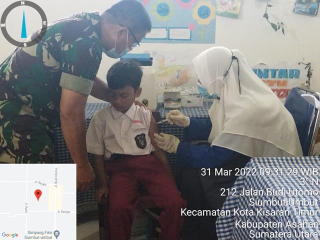 Asahan  |  Dalam rangka mendukung kegiatan Serbuan Vaksinasi dan memutus penularan Covid-19, dalam hal ini seperti halnya yang dilakukan oleh Personel Bintara Pembina Desa (Babinsa) Koramil 06/Kisaran jajaran Kodim 0208/Asahan Serka Syafriman turun kewilayah binaan untuk melaksanakan kegiatan pendampingan terhadap warga desa binaan, yang melaksanakan Vaksinasi kepada anak sekolah dasar dalam rangka agar tidak tidak perlu takut dan ragu di Vaksin serta tetap mematuhi protokol kesehatan yang turut serta dihadiri oleh Ibu Fuji Rahayu Kepala Sekolah, Nakes Puskesmas Mutiara, Nurid SD didampingi orang tua dan Wali murid, kegiatan tersebut yang dilaksanakan bertempat di dua Sekolah, SD Negeri 013849 dan SD Negeri 018453 yang beralamat di Jalan Budi Utomo Kelurahan Siumbut-umbut Kecamatan Kisaran Timur Kabupaten Asahan, Kamis (31/03/2022).