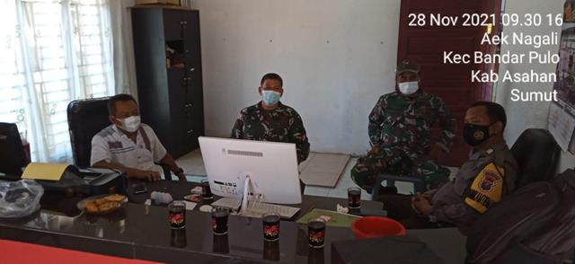 Asahan  |  Ciptakan keakraban dan kekompakan Babinsa dengan berbagai lapisan masyarakat, salah satunya dengan aparat Personel Bintara Pembina Desa (Babinsa) Koramil 15/Bandar Pulau jajaran Kodim 0208/Asahan Serma M. Nasution dan Babinkamtibmas turun kewilayah binaan untuk turut serta melaksanakan kegiatan Komunikasi Sosial (Komsos) bersama dengan perangkat desa dalam rangka untuk Pendataan Warga yang sudah dan belum di Vaksin Covid-19 bersama dengan Kades Aek Nagali (Bapak Subono) dan Babinkamtibmas (Bripka M. Tumanggor), kegiatan tersebut yang dilaksanakan bertempat di Desa Aek Nagali Kecamatan Bandar Pulau Kabupaten Asahan, Minggu (28/11/2021).