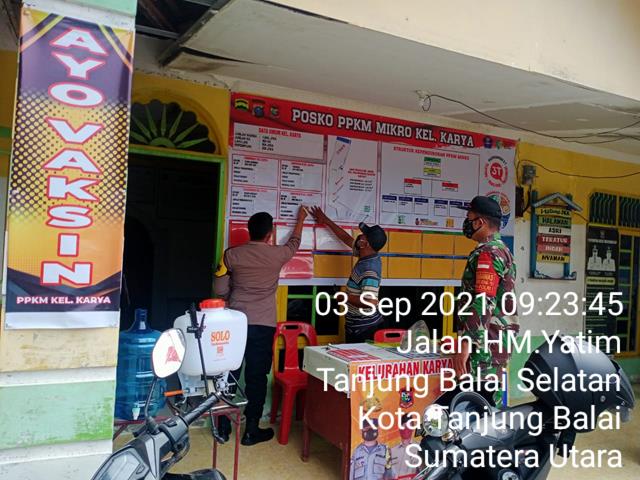 Tanjung Balai | Dengan menyusuri jalan dan tempat-tempak aktifitas baik ditempat cucian sepeda motor, warung makan dan tempat keramaian yang menimbulkan kerumunan yang ada di wilayah Dusun, jajaran pemerintah Desa Binaan bersama Babinsa tiada henti-hentinya terus memberikan edukasi himbauan Kepada semua warga masyarakat tentang pengendalian penyebaran virus covid-19 untuk mematuhi protokol kesehatan dengan jaga jarak serta selalu menggunakan masker, dalam hal ini Personel Bintara Pembina Desa (Babinsa) Koramil 09/Tanjung Balai jajaran Kodim 0208/Asahan Praka J. Tanjung turun kewilayah binaan untuk melaksanakan kegiatan Pemasangan Spanduk data Posko PPKM di Kantor Kelurahan bersama dengan Bapak Sabaruddin S.M.( Lurah Karya), Babhinkamtibmas Karya (Briptu Panji S) dan Kepling IV (Bapak Ilham Nasution), kegiatan tersebut yang dilaksanakan bertempat di Jalan HM. Yatim Kelurahan Karya Kecamatan Tanjung Balai Selatan Kota Tanjung Balai, Jumat (03/09/2021).