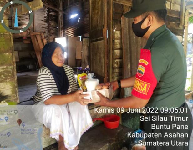 Asahan | Guna meringankan beban masyarakat yang terdampak pandemi wabah Virus Corona (Covid-19), dalam hal ini seperti yang dilakukan oleh Personel Bintara Pembina Desa (Babinsa) Koramil 13/Buntu Pane jajaran Kodim 0208/Asahan Sertu Toni Suwandi turun kewilayah desa binaan untuk melaksanakan kegiatan pembagian sembako berupa minyak goreng, telur dan gula kepada ibu Sumarni warga yang kurang mampu, kegiatan tersebut yang dilaksanakan bertempat di Dusun l B Desa Sei Silau Timur Kecamatan Buntu Pane Kabupaten Asahan, Kamis (09/06/2022).