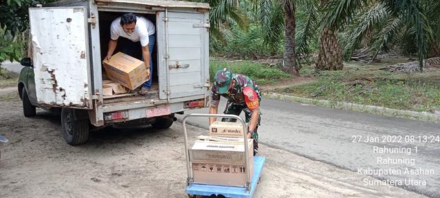 Asahan  |  Dinas Kesehatan Kabupaten Asahan melalui Seksi Tata Kelola Obat dan Pelayanan Kefarmasian melaksanakan pendistribusian obat dan logistik penanganan Covid-19 ke sejumlah Puskesmas yang ada di perbatasan wilayah Kabupaten Asahan. Seperti halnya yang dilakukan oleh Personel Bintara Pembina Desa (Babinsa) Koramil 15/Bandar Pulau jajaran Kodim 0208/Asahan Sertu Herdianto turun kewilayah binaan untuk melaksanakan kegiatan membantu UPTD Puskesmas Rahuning dalam rangka untuk menerima Dorongan Logistik Obat obatan dari Dinas Kesehatan Kabupaten untuk kebutuhan Masyarakat Kecamatan Rahuning bersama dengan Kepala Puskesmas Rahuning Ibu Elvina Hasibuan SKM, Bhabinkamtibmas Rahuning 1 Briptu M Nico Hardianto dan Nakes dari Dinkes Kabupaten Asahan, kegiatan tersebut yang dilaksanakan bertempat di Dusun 5 Desa Rahuning 1 Halaman Puskesmas Kecamatan Rahuning Kabupaten Asahan, Kamis (27/01/2022).