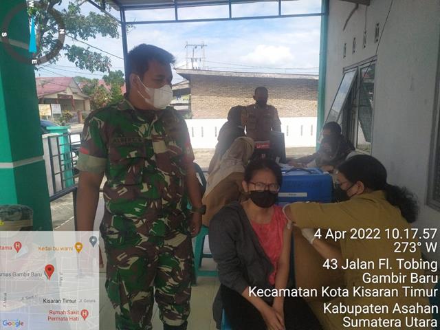 Asahan | Demi untuk kelancaran pelaksanaan kegiatan serbuan vaksinasi yang diberikan kepada Masyarakat diwilayah binaan, dalam kesempatan ini seperti halnya yang dilakukan oleh Personel Bintara Pembina Desa (Bbainsa) Koramil 06/Kisaran jajaran Kodim 0208/Asahan Praka Rio Sihotang turun kewilayah binaan untuk melaksanakan kegiatan pendampingan dan monitoring pelaksanaan Vaksinasi kepada masyarakat diwilayah binaan bersama dengan Ibu Trisnawati, PLT Kapuskesmas Gambir Baru, Bripka Hafizul Bhabinkamtibmas, Nakes Puskesmas Gambir Baru dan Masyarakat yang melaksanakan Vaksinasi, kegiatan tersebut yang dilaksanakan bertempat di Puskesmas Gambir Baru Jalan FL. Tobing Kelurahan Gambir Baru Kecamatan Kisaran Timur Kabupaten Asahan, Senin (04/04/2022).