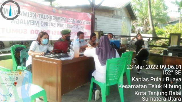 Tanjung Balai  |  Dalam upaya membantu kelancaran kegiatan vaksinasi, dalam hal ini seperti yang dilakukan oleh Personel Bintara Pembina Desa Koramil 08/Pulau Buaya jajaran Kodim 0208/Asahan Sertu HM Pasaribu turun kewilayah binaan untuk melaksanakan Pendampingan Vaksinasi kepada Masyarakat dengan kategori Anak anak, Masyarakat umum dan Lansia agar terhindar dari Covid 19 dan tetap mematuhi Prokes demi kesehatan dan keselamatan kita bersama dengan Aiptu Budi (Babinkamtibmas), Bapak Hemat (Kapus) dan Lurah/Kepling, kegiatan tersebut yang dilaksanakan bertempat di Kantor Polsek Teluk Nibung Kelurahan Kapias Pulau Buaya Kecamatan Teluk Nibung Kota Tanjung Balai, Rabu (23/03/2022).