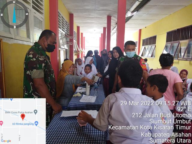 Asahan | Dalam rangka Program Vaksinasi Covid-19 di wilayah Kabupaten Asahan telah berjalan di berbagai faskes maupun kelurahan setempat, dengan sasaran masyarakat diwilayah tersebut guna untuk mensukseskan program vaksinasi nasional, seperti halnya yang dilakukan oleh Personel Bintara Pembina Desa (Babinsa) Koramil 06/Kisaran jajaran Kodim 0208/Asahan Serka Syafriman dan Serka Suroso turun kewilayah binaan untuk melaksanakan kegiatan pendampingan Vaksinasi kepada anak usia 6-11 Tahun di Sekolah Dasar dan terus menghimbau masyarakat untuk mau di vaksin dan menghimbau agar tetap mematuhi Disiplin Protokol Kesehatan bersama dengan dr. Emi Ketua Tim Vaksinasi, Kompol Zulhajri, Nakes Puskesmas Mutiara dan Peserta Vaksinasi, kegitan tersebut yang dilaksanakan bertempat di Sekolah Dasar Negeri 013849 dan Sekolah Dasar Negeri 018453 Jalan Budi Utomo Kelurahan Siumbut Umbut Kecamatan Kisaran Timur Kabupaten Asahan, Selasa (29/03/2022).