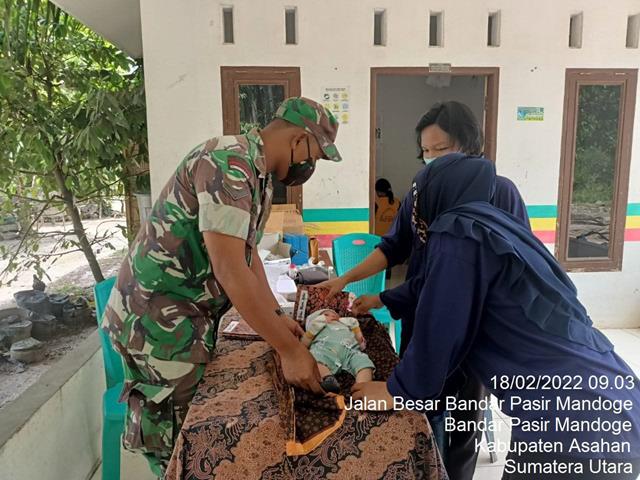 Asahan | Posyandu adalah wadah pemeliharaan kegiatan kesehatan dasar yang diselenggarakan dari, oleh dan untuk masyarakat yang dibantu oleh petugas kesehatan. Babinsa Koramil 14/ Bandar Pasir Mandoge, Serda Sudarman turut serta melaksanakan kegiatan pendampingan Posyandu bersama Bidan Desa dan Ibu-ibu Masyarakat Dusun l yang sedang membawa Anak Balita untuk mengikuti Imunisasi, bertempat di Posyandu Melatih Dusun I, Desa Bandar Pasir Mandoge, Kecamatan Bandar Pasir Mandoge, Kabupaten Asahan, Jumat (18/02/2022).