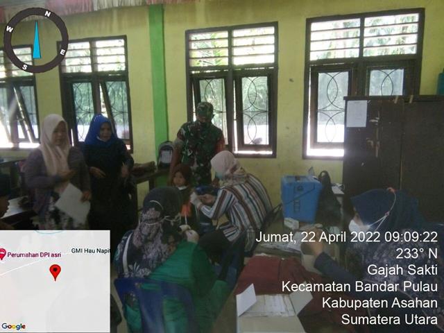 Asahan  |  Dalam rangka mendukung kegiatan Serbuan Vaksinasi dan memutus penularan Covid-19, dalam hal ini Personel Bintara Pembina Desa (Babinsa) Koramil 15/Bandar Pulau jajaran Kodim 0208/Asahan Sertu Fiha Tasikurun dan Kopda Sutopo  turun kewilayah binaan untuk turut serta melaksanakan kegiatan Pendampingan Serbuan Vaksinasi dan pendataan warga masyarakat binaan yang belum melaksanakan Vaksin kedua dan ketiga yang berada di dusun empat desa Gajah Sakti.Adapun tujuan kegiatan ini di lakukan, salah satunya membina silaturrahmi dan menjaga kekompakan yang harmonis antara Babinsa dan masyarakat, kegiatan tersebut yang dilaksanakan bertempat di Desa Gajah Sakti Kecamatan Bandar Pulau Kabupaten Asahan, Jumat (22/04/2022).
