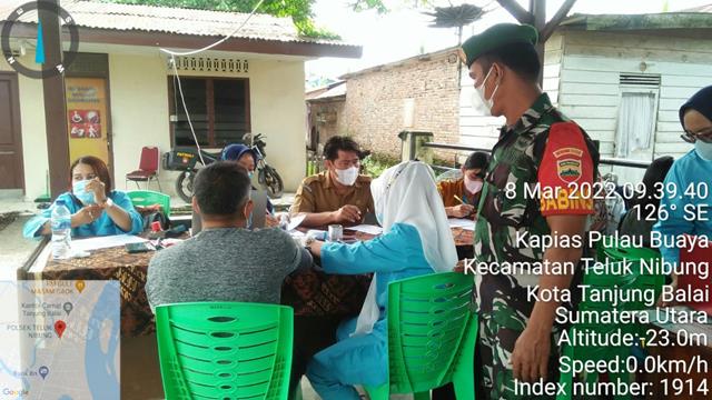 Tanjung Balai | Dalam rangka mendukung kegiatan Serbuan Vaksinasi dan memutus penularan Covid-19, dalam hal ini seperti yang dilakukan oleh Personel Bintara Pembina Desa (Babinsa) Koramil 08/Pulau Buaya jajaran Kodim 0208/Asahan Sertu HM. Pasaribu turun kewilayah binaan untuk turut serta melaksanakan kegiatan Pendampingan Tim Vaksinator Puskesmas Sipori-Pori Dosis l, ll dan lll Booster untuk Masyarakat umum agar tercapainya masyarakat yang sehat terhindar dari Covid 19 serta selalu mematuhi Prokes, kegiatan tersebut yang dilaksanakan bertempat di Kantor Kapolsek Teluk Nibung Jalan Letjend Suprapto Kelurahan Kapias Pulau Buaya Kecamatan Teluk Nibung Kota Tanjung Balai, Selasa (08/03/2022).