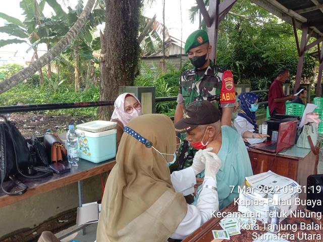 Tanjung Balai | Angka terkomfirmasi Covid 19 di Kota Tanjung Balai semakin meningkat dalam bulan terakhir ini, upaya pencegahan Covid-19 Pemerintah bekerjasama dengan Puskesmas melaksanakan Vaksinasi Tahap l, ll dan III dosis lanjutan (Booster), dalam hal ini seperti yang dilakukan oleh Personel Bintara Pembina Desa (Babinsa) Koramil 08/Pulau Buaya jajaran Kodim 0208/Asahan Sertu Ahmadi turun kewilayah binaan untuk melaksanakan kegiatan pendampingan Tim Vaksinator Puskesmas Sipori-Pori Dosis l, ll dan lll Booster untuk Masyarakat umum agar tercapainya masyarakat yang sehat terhindar dari Covid 19 serta selalu mematuhi Prokes, kegiatan tersebut yang dilaksanakan bertempat di Kantor Kapolsek Teluk Nibung Jalan Letjend Suprapto Kapias Pulau Buaya Kecamatan Teluk Nibung Kota Tanjung Balai, Senin (07/03/2022).