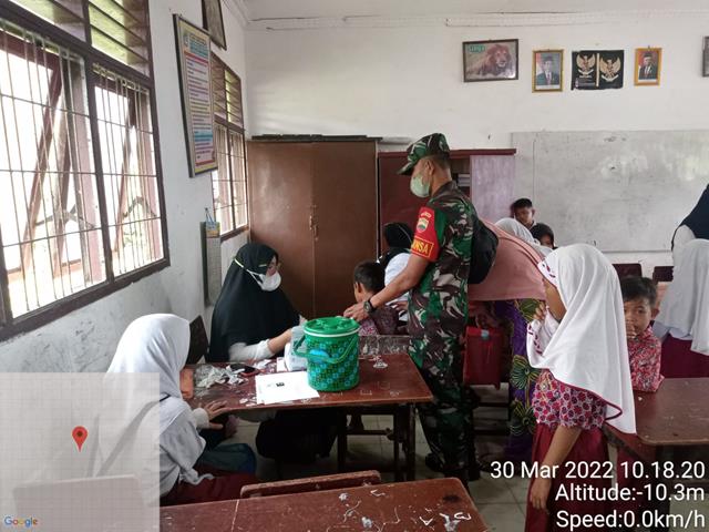 Asahan | Kedatangan para Babinsa pada pelaksanaan vaksinasi covid-19 untuk warga di wilayah binaannya, mendatangi satu persatu lokasi kegiatan vaksinasi covid-19 di tiap-tiap wilayah untuk memonitoring kegiatan tersebut agar berjalan dengan baik dan lancar, dalam hal in seperti yang dilakukan oleh Personel Bintara Pembina Desa (Babinsa) Koramil 08/Pulau Buaya jajaran Kodim 0208/Asahan Serda Faisal Lubis turun kewilayah binaan untuk melaksanakan kegiatan pendampingan Tim Vaksinator Puskesmas Bagan Asahan Dosis l & II untuk Anak sekolah SD agar tetap sehat dan terhindar dari Covid 19 serta selalu mematuhi Prokes, bersama dengan Ibu Fika (Vaksinator), Ibu Fina (Vaksinator) dan Ibu Atun (Vaksinator), kegiatan tersebut yang dilaksanakan bertempat di SD Negri 0144632 Bagan Asahan Kecamatan Tanjung Balai Kabupaten Asahan, Rabu (30/03/2022).