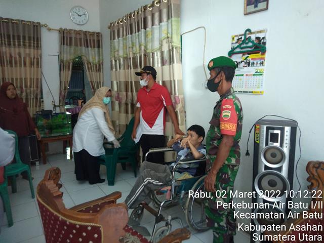 Asahan  |  Dalam rangka mendukung kegiatan Serbuan Vaksinasi dan memutus penularan Covid-19 diwilayah binaan, dalam hal ini seperti yang dilakukan oleh Personel Bintara Pembina Desa (Babinsa) Koramil 12/Air Batu jajaran Kodim 0208/Asahan Serma Rahmad turun kewilayah binaan untuk melaksanakan kegiatan Pendampingan Vaksinasi Dosis I, II dan III Vaksin Sinovac dan Pfizer untuk warga masyarakat Desa Sijabut Teratai, kegiatan tersebut yang dilaksanakan bertempat di Dusun III  Aula Balai Desa Sijabut Teratai Kecamatan Air Batu Kabupaten Asahan, Rabu (02/03/2022).
