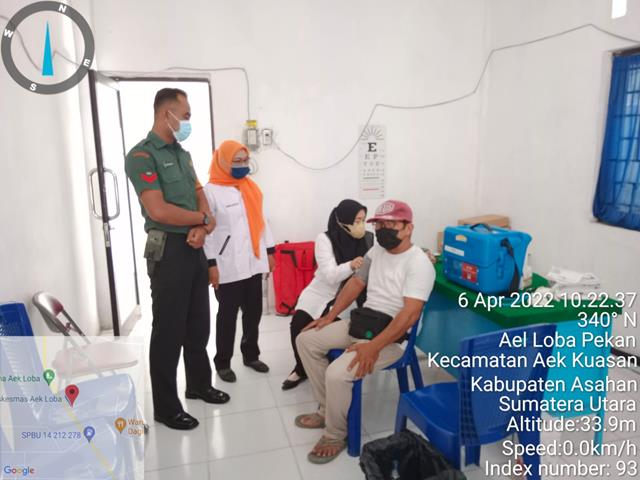Asahan | Tujuan pemberian vaksin ini untuk kepada warga Masyarakat binaan, guna meningkatkan imunitas tubuh dalam jangka panjang dan kita berharap walaupun sudah menerima vaksin agar tetap utamakan protokol kesehatan dalam melaksanakan kegiatan baik di pesantren ataupun di luar rumah, dalam hal ini seperti yang dilakukan oleh Personel Bintara Pembina Desa (Babinsa) Koramil 16/Pulau Rakyat jajaran Kodim 0208/Asahan Serka Sahrul dan Koptu Hardianto turun kewilayah desa binaan untuk melaksanaan kegiatan memberikan himbauan, monitoring dan pengamanan pelaksanaan Vaksinasi kepada masyarakat diwilayah binaan bersama dengan Kapuskesmas Aekloba (Dr. Benny), Korim Puskesmas Aekloba (Ibu Rina) dan Masyarakat yang melaksanakan suntik Vaksin, kegiatan tersebut yang dilaksanakan bertempat di Puskesmas Aekloba Kecamatan Aek Kuasan Kabupaten Asahan, Rabu (06/04/2022).