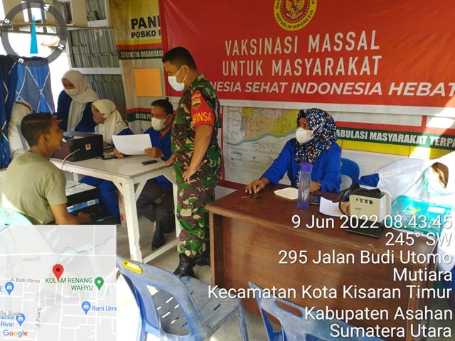 Asahan  |  Program pemerintah untuk memberikan vaksinasi kepada seluruh masyarakat mulai usia 6 tahun sampai dengan Lansia tetap di Laksanakan dan Babinsa selaku Pembina di masyarakat Wajib mensukseseskan Program Pemerintah tersebut, dimana dalam pelaksanaan vaksinasi hari ini antusias warga sangat besar, sebagai upaya percepatan vaksinasi menyeluruh Dosis 1, 2 dan 3 (Booster), pihak Puskesmas beserta Babinsa diwilayah binaan melakukan kegiatan Vaksinasi, dalam hal ini seperti yang dilakukan oleh Personel Bintara Pembina Desa Koramil 06/Kisaran jajaran Kodim 0208/Asahan Serka Syafriman turun kewilayah binaan untuk melaksanakan kegiatan pendampingan pelaksanaan Vaksinasi Covid-19 kepada masyarakat binaan bersama dengan Ketua Tim Nakes dr Khairul Pulungan, Nakes dari Puskesmas Mutiara dan Aki Parhan Hasibuan Pasien Vaksinasi, kegiatan tersebut yang dilaksanakan bertempat di Kantor Lurah Mutiara Jalan Budi Utomo Lingkungan I Kelurahan Mutiara Kecamatan Kisaran Timur Kabupaten Asahan, Kamis (09/06/2022).