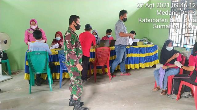 Batu Bara  |  Pendampingan “Kegiatan Vaksinasi yang dilaksanakan merupakan Program dari Pemerintah dalam  memberikan vaksinasi kepada seluruh Warga  Masyarakat Indonesia  Khususnya di wilayah Batu Bara, seperti halnya yang dilakukan oleh Personel Bintara Pembina Desa (Babinsa) Koramil 01/Medang Deras jajaran Kodim 0208/Asahan Serda Halomoan Manik turun kewilayah desa binaan untuk melaksanakan kegiatan pendampingan pelaksanaan Vaksinasi kepada masyarakat sekaligus melaksanakan kegiatan Komunikasi Sosial (Komsos) bersama warga binaan, dengan menghimbau warga untuk mengikuti giat vaksinasi dan selalu menggunakan masker bila keluar rumah agar terputus mata rantai penyebaran virus Covid-19 bersama dengan Bapak Junaidi, Bapak Arif dan Bapak Rebinson, kegiatan tersebut yang dilaksanakan bertempat di Desa Tanjung Sigoni Kecamatan Medang Deras Kabupaten Batu Bara, Jumat (27/08/2021).