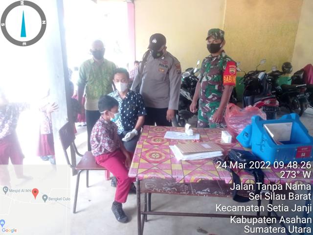 Asahan | Pendampingan kegiatan kali ini yaitu serbuan vaksinasi Covid-19, yang menyasar kepada anak usia 6-11 Tahun, “Vaksinasi anak usia 6-11 tahun ini, juga merupakan program Pemerintah dalam upaya untuk mencegah penyebaran pandemi yang berlangsung hingga saat ini, sekaligus bertujuan untuk memperkuat stamina dan imun tubuh, agar terhindar dari virus Covid-19, seperti halnya yang dilakukan oleh Personel Bintara Pembina Desa (Babinsa) Koramil 13/Buntu Pane jajaran Kodim 0208/Asahan Serka Yudianto dan Koptu Siryanto turun kewilayah binaan untuk melaksanakan kegiatan pendampingan Vaksinasi untuk usia 6 s/d 11 Tahun, kegiatan tersebut yang dilaksanakan bertempat di SD Negeri 010106 Sei Silau Barat Kecamatan Setia Janji Kabupaten Asahan, Kamis (24/03/2022).