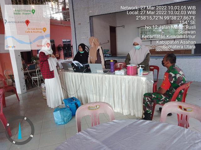 Asahan | Sebelum di vaksin masyarakat melaksanakan beberapa proses diantaranya terlebih dahulu melaksanakan pendaftaran dilanjutkan pemeriksaan screening, kemudian penyuntikan vaksin terakhir Observasi, seperti halnya saat ini yang dilakukan oleh Personel Bintara Pembina Desa (Babinsa) Koramil 06/Kisaran jajaran Kodim 0208/Asahan Serka Suroso turun kewilayah binaan untuk melaksanakan kegiatan pendampingan Vaksinasi terhadap warga masyarakat desa binaan bersama dengan Iptu Cecep dari Polres, Tim Vaksinasi dari Puskesmas Mutiara dan Peserta Vaksinasi, dalam rangka kegiatan penyuntikan Vaksin Covid -19 tersebut yang dilaksanakan bertempat di Hotel Safitri tepatnya di Kelurahan Selawan Kecamatan Kisaran Timur Kabupaten Asahan, Minggu (27/03/2022).