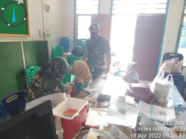 Tanjung Balai | Dalam rangka mendukung kegiatan Serbuan Vaksinasi dan memutus penularan Covid-19, dengan melaksanakan pendampingan kepada warganya vaksinasi Covid-19, seperti halnya yang dilakukan oleh Personel Bintara Pembina Desa (Babinsa) Koramil 08/Pulau Buaya jajaran Kodim 0208/Asahan Serma Irwansyah turun kewilayah binaan untuk melaksanakan kegiatan pendampingan Nakes Puskesmas Lalang dalam rangka program Vaksinasi Dosis l, ll dan lll Booster untuk anak-anak, Masyarakat umum dan Lansia agar tercapainya masyarakat yang sehat terhindar dari Covid 19 serta selalu mematuhi Prokes guna tercapaiannya percepatan Vaksinasi bagi Warga yang belum tervaksin bersama dengan Padal Polres Tanjung Balai (Iptu L Hutapea), Babinkamtibmas (Aiptu T C Panjaitan) dan Nakes, kegiatan tersebut yang dilaksanakan bertempat di Puskesmas Teluk Nibung Jalan Bawal Kelurahan Pematang Pasir Kecamatan Teluk Nibung Kota Tanjung Balai, Senin (18/04/2022).