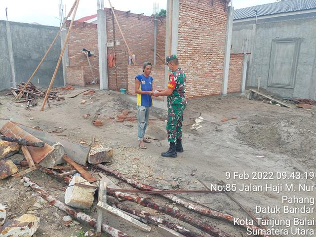 Tanjung Balai | Guna untuk memutus mata rantai penyebaran Virus Covid-19 di wilayah Binaan, salah satu titik yang termasuk ramai dipenuhi oleh masyarakat, baik itu untuk berbelanja maupun tempat bekerja, dalam hal ini seperti halnya yang dilakukan oleh Personel Bintara Pembina Desa (Babinsa) Koramil 17/Datuk Bandur jajaran Kodim 0208/Asahan Kopda Agus Nuryaddin turun langsung kewilayah binaan untuk melaksanakan giat melaksanakan pengawasan protokol Covid-19 kepada masyarakat dengan memberikan masker kepada masyarakat serta memberikan pemahaman new normal yaitu menggunakan masker setiap keluar rumah, cuci tangan pakai sabun, menjaga jarak, serta menghimbau masyarakat agar mengikuti Protokoler Kesehatan diwilayah binaan, kegiatan tersebut yang dilaksanakan bertempat di Jalan H.M. Nur Kelurahan Pahang Kecamatan Datuk Bandar Kota Tanjung Balai, Rabu (09/02/2022).