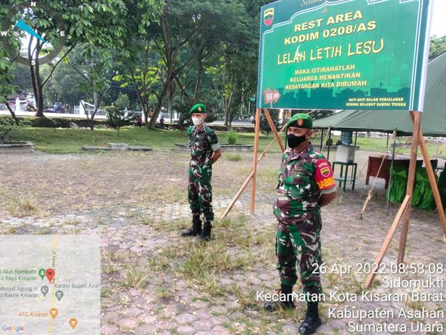 Dengan melaksanakan Pos Rest Area dalam rangka pelayanan arus mudik dan arus balik hari Raya Idul Fitri 1443 H/2022 M di wil Kodim 0208/As, pada pelaksanaan kegiatan tersebut Babinsa Serma Syahrul Warta Wijaya bersama anggota Polsek dengan melaksanakan kegiatan pengamanan arus mudik lebaran 1443 H dengan memberikan rasa nyaman dan keamanan para pemudik lebaran di Pos pengamanan. Pos pengamanan di wilayah Alun-alun Kisaran untuk memantau lalu lintas arus mudik di pos tersebut para petugas melakukan siaga, termasuk personel dari Koramil 13/Buntu Pane. Setiap pos diperbantukan 1-3 personel yang siaga dalam pelaksanaannya secara bergantian.