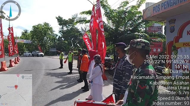 Asahan | Dalam rangka Pos-pos pengamanan (POSPAM) menjelang hingga pasca lebaran, kegiatan pengamanan rutin tahunan itu, sebagai upaya TNI-Polri untuk memberikan rasa nyaman kepada masyarakat, saat merayakan Idul fitri, dalam hal ini seperti yang dilakukan oleh Personel Bintara Pembina Desa (Babinsa) Koramil 10/Sei Kepayang jajaran Kodim 0208/Asahan Kopda MD Sihombing turun kewilayah untuk turut serta melaksanakan kegiatan Operasi Ketupat Toba Tahun 2022 di Pos Pam Lebaran Batu 7 Tanjung Balai dan membagikan masker kepada warga masyarakat serta menghimbau untuk tetap mengutamakan keselamatan dan berhati-hati saat melaksanakan perjalanan mudik, kegiatan tersebut yang dilaksanakan bertempat di Jalan Jendral Sudirman KM 7,5 Kelurahan Sijambi Kecamatan Datuk Bandar Kota Tanjung Balai, Kamis (05/05/2022).