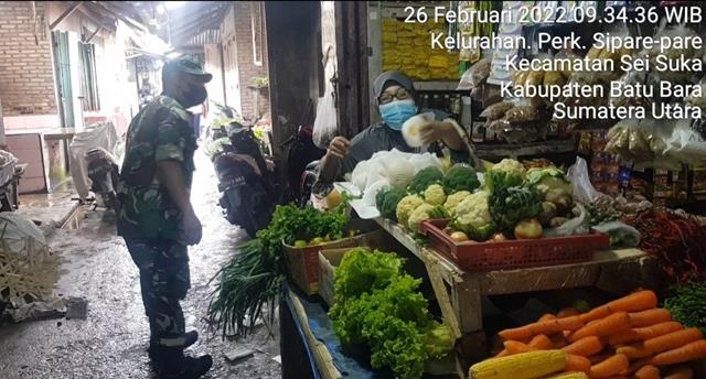 Batu Bara  |  Para pedagang dan pengunjung sangat antusias dgn arahan dari Babinsa untuk mematuhi Protokoler Kesehatan demi menjaga kesehatan bersama, dengan melaksanakan Pam Disiplin Mandiri Covid-19 di Pasar Delima Indrapura menghimbau kepada para pedagang dan konsumen agar selalu mematuhi Protokol Kesehatan guna mencegah penyebaran virus covid-19. Dalam kesempatan ini Personel Bintara Pembina Desa (Babinsa) Koramil  02/Air Putih jajaran Kodim 0208/Asahan Serda Anwar Sadat dan Serda Supriadi turun kewilayah binaan untuk melaksanakan kegiatan Pam Penegakan Disiplin Protokol Kesehatan diwilayah binaan, kegiatan tersebut yang dilaksanakan tepatnya di Pasar Delima Indrapura Kecamatan Air Putih Kabupaten Batu Bara, Sabtu (26/02/2022).