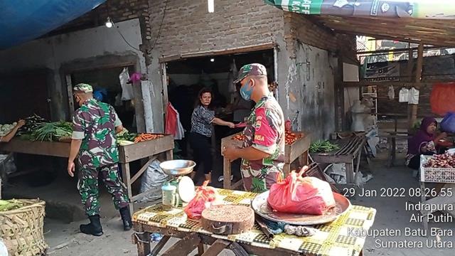 Batu Bara | Para pedagang dan pembeli merasa senang karna Babinsa selalu menghimbau untuk mematuhi protokoler kesehatan. Dalam rangka untuk memutus penyebaran virus corona (Covid-19) diwilayah binaan, dalam hal ini seperti halnya yang dilakukan oleh Personel Bintara Pembina Desa (Babinsa) Koramil 02/Air Putih jajaran Kodim 0208/Asahan Sertu Ady Sutrisno dan Sertu Risman turun kewilayah binaan untuk melaksanakan kegiatan Pam Disiplin Mandiri Covid-19 di Pasar Delima Indrapura menghimbau kepada para pedagang dan konsumen agar selalu mematuhi Protokol Kesehatan guna mencegah penyebaran virus covid-19, kegiatan tersebut yang dilaksanakan bertempat di Pasar Delima Indrapura Kecamatan Air Putih Kabupaten Batu Bara, Sabtu (29/01/2022).