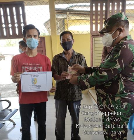 Batu Bara | Guna memberikan rasa aman dan nyaman kepada warganya pada pelaksanaan pembagian beberapa bantuan sosial akibat pademi Covid-19 di lakukan oleh Babinsa, seprti halnya yang dilakukan oleh Personel Bintara Pembina Desa (Babinsa) Koramil 01/Medang Deras jajaran Kodim 0208/Asahan Peltu Hendrik S turun kewilayah desa binaan untuk melaksanakan kegiatan Pengamanan pembagian Bantuan langsung tunai (BLT) di Desa binaan dan selalu menjaga Perokes bersama dengan Kades (P.Aritonang), Bapak Boin Panjaitan, Ibu Fitriah dan Para Kadus, dengan tetap memakain masker apabila keluar rumah, kegiatan tersebut yang dilaksanakan bertempat di Desa Cengkring Pekan Kecamatan Medang Deras Kabupaten Batu Bara, Kamis (16/09/2021).