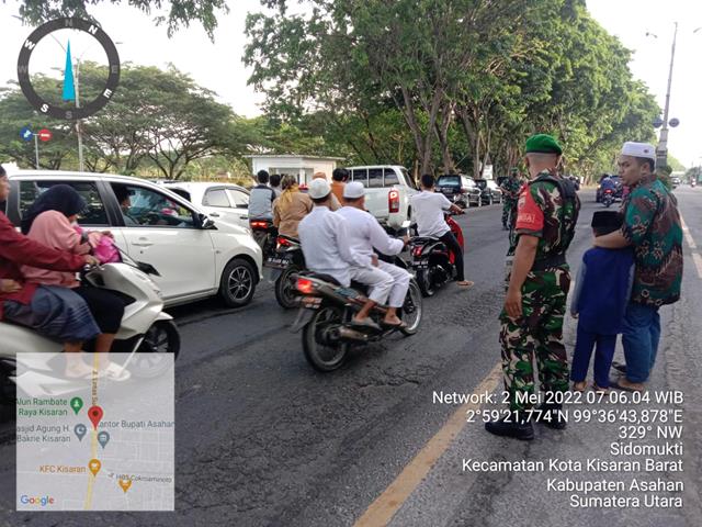 Asahan  |  Pada hari ini seluruh umat Islam di seluruh Indonesia merayakan hari raya Idul Fitri 1443 H dengan melaksanakan ibadah sholat Idul Fitri di masjid-masjid atau di lapangan, dalam kesempatan yang baik ini seperti yang dilakukan oleh Personel Bintara Pembina Desa (Babinsa) Koramil 06/Kisaran jajaran Kodim 0208/Asahan Serka Yusuf Harahap, Serda Agus Irwanto dan Serda Kamaluddin turun kewilayah binaan untuk melaksanakan kegiatan Pengamanan Sholat Idul Fitri 1443 H, yang tergabung dengan Personel TNI 3 orang, PersonelDishub 3 orang dan Pol PP 2 rang, kegiatan tersebut yang dilaksanakan bertempat di Masjid Agung H. Achmad Bakrie, Jalan Jenderal Ahmad Yani Kecamatan Kota Kisaran Barat Kabupaten Asahan, Senin (02/05/2022).