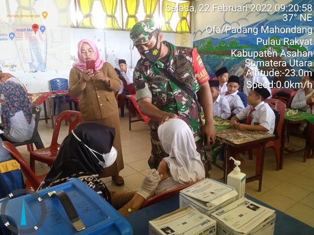 Asahan  |  Dalam rangka untuk mensukseskan Vaksinasi diwilayah Kabupaten Simalungun, maka dari itu seperti yang dilakukan oleh Personel Bintara Pembina Desa (Babinsa) Koramil 16/Pulau Rakyat jajaran Kodim 0208/Asahan Serma Syahminan, Sertu H. Marpaung, Serda Monang Sitorus, Serda Iswandi Marbun dan Serda Nampati Tarigan turun kewilayah binaan untuk turut serta melaksanakan kegiatan monitoring siswa berusia 6 sampai 11 tahun dan warga masyarakat dengan mengikuti vaksinasi Covid-19 dalam rangka untuk mendukung program tersebut, TNI dan Polri turut melakukan pengamanan dan pemantauan vaksinasi, kegiatan tersebut yang dilaksanakan bertempat di Puskesmas Pulau Rakyat Tua dan Puskesmas Ofa Padang Mahondang  Kecamatan Pulau Rakyat Kabupaten Asahan, Selasa (22/02/2022).