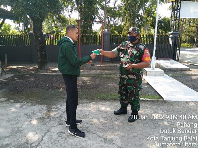 Tanjung Balai  |  Guna untuk memutus mata rantai penyebaran Virus Covid 19 di wilayah Binaan, dalam hal ini seperti halnya yang dilakukan Personel Bintara Pembina Desa (Babinsa) Koramil 17/Datuk Bandar jajaran Kodim 0208/Asahan Pelda Herianto turun kewilayah binaan untuk melaksanakan pengawasan protokol covid-19 kepada masyarakat dengan membagikan masker dan memberikan pemahaman New Normal yaitu menggunakan masker setiap keluar rumah,cuci tangan pakai sabun, dan menjaga jarak, kegiatan tersebut yang dilaksanakan bertempat di Jalan H.Husni Thamrin Kelurahan Pahang Kecamatan Datuk Bandar Timur Kota Tanjung Balai, Jumat (28/01/2022).