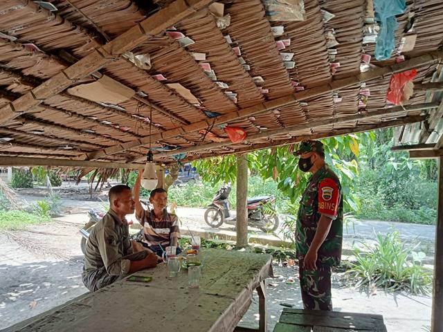 Simalungun | Guna untuk memutus mata rantai penyebaran Virus Covid 19 di wilayah Binaan, Personel Bintara Pembina Desa (Babinsa) Koramil 19/Silau Kahaen jajaran Kodim 0207/Simalungun Sertu teno Lubis turun kewilayah binaan untuk melaksanakan pengawasan Disiplin Protokol Kesehatan dalam rangka untuk memutus penyebaran Virus Covid-19 kepada masyarakat serta dengan membagikan masker dan memberikan pemahaman New Normal yaitu menggunakan masker setiap keluar rumah, cuci tangan pakai sabun dan menjaga jarak, menjauhi kerumunan dan mengurangi mobilitas untuk memutus penyebaran Covid-19, kegiatan tersebut yang dilaksanakan bertempat di Nagori Pardomuan Bandar Kecamatan Silau Kaehan Kabupaten Simalungun, Selasa (29/03/2022).
