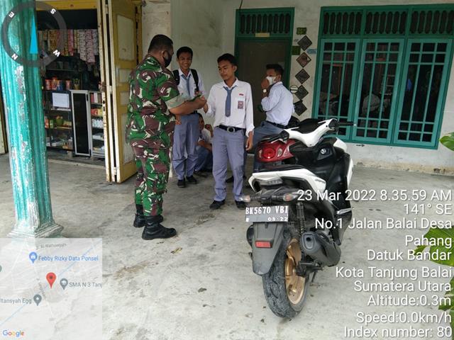 Tanjung Balai | Guna untuk memutus mata rantai penyebaran Virus Covid 19 di wilayah Binaan, dengan melaksanakan Melalui Komunikasi Sosial (Komsos) para Babinsa memberikan himbauan kepada warga binaan agar tetap mematuhi protokol kesehatan, dalam hal ini seperti yang dilakukan oleh Personel Bintara Pembina Desa Koramil 17/Datuk Bandar jajaran Kodim 0208/Asahan Pelda Herianto turun kewilayah binaan untuk melaksanakan kegiatan pengawasan protokol Covid-19 kepada masyarakat dengan membagikan masker serta menghimbau dan memberi pemahaman New Normal yaitu selalu menggunakan masker setiap keluar rumah,cuci tangan pakai sabun dengan air mengalir menjaga jarak dan menghindari kerumunan, kegiatan tersebut yang dilaksanakan bertempat di Jalan SMA Negeri 3 Lingkungan III Kelurahan Gading Kecamatan Datuk Bandar Kota Tanjung Balai, Rabu (23/03/2022).