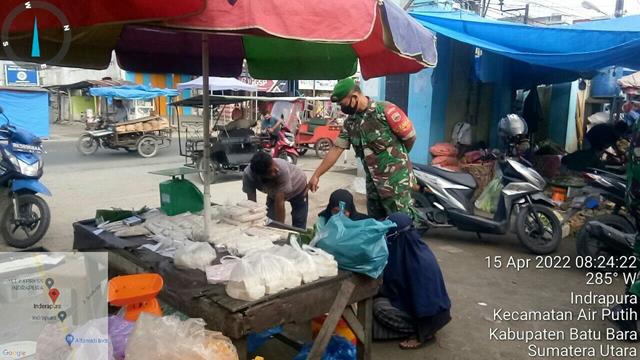 Batu Bara | Dalam rangka untuk mencegah penyebaran virus corona (Covid-19) dikalangan pedagan dan masyarakat diwilayah binaan, dalam hal ini Personel Bintara Pembina Desa (Babinsa) Koramil 02/Air Putih jajaran Kodim 0208/Asahan Serda Supardi dan Serda Indra turun kewilayah binaan untuk turut serta melaksanakan Pam Disiplin Mandiri Covid-19 di Pasar Delima Indrapura menghimbau kepada para pedagang dan konsumen agar selalu mematuhi Protokol Kesehatan guna mencegah penyebaran virus covid-19, kegiatan tersebut yang dilaksanakan bertempat di Pasar Delima Indrapura Kecamatan Air Putih Kabupaten Batu Bara, Jumat (15/04/2022).