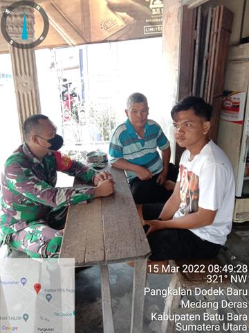 Batu Bara  |  Kegiatan ini merupakan kegiatan rutinitas aparat Komando Kewilayahan, guna meningkatkan hubungan harmonisasi antara aparat teritorial yakni sebagai Babinsa terhadap aparat desa binaannya, agar terjalin hubungan yang baik dengan cara komunikasi social, dalam rangka meningkatkan sinergitas di wilayah binaanya, dalam hal ini seperti yangdilakukan oleh Personel Bintara Pembina Desa (Babinsa) Koramil 01/Medang Deras jajaran Kodim 0208/Asahan Serda Supriadi turun kewilayah binaan untuk melaksanakan kegiatan Komunikasi Sosial (Komsos) bersama dengan Aparatur Desa Sei Rakyat Bapak Junaidi Manulang dan Bapak Usmansyah dalam rangka agar terjalin hubungan silaturahmi yang baik antara babinsa dengan aparatur desa, serta mengingatkan agar selalu mematuhi Protokol kesehatan, kegiatan tersebut yang dilaksanakan bertempat di Desa Sei Rakyat Kecamatan Medang Deras Kabupaten Batu Bara, Selasa (15/03/2022).