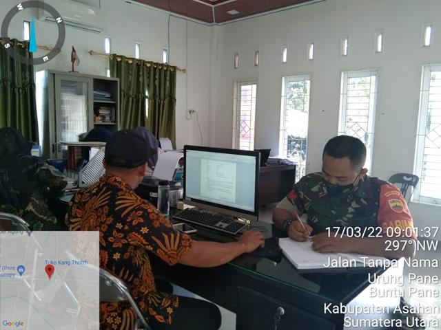 Asahan  |  Terus memperbaharui data wilayah binaanya, dalam hal ini seperti yang diolakukan oleh Personel Bintara Pembina Desa (Babinsa) Koramil 13/Buntu Pane jajaran Kodim 0208/Asahan Koptu Siryanto turun kewilayah binaan untuk melaksanakan kegiatan Pul Data Ter dalam rangka untuk mengetahui dan memperbaharui Data yang terbaru jumlah penduduk diwilayah binaan bersama dengan Kepala Desa Urung Pane Bapak Misnan, Kaur Desa Bapak Dasimun dan Para Perangkat Desa Urung Pane, kegiatan tersebut yang dilaksanakan bertempat di Kantor Desa Urung Pane Kecamatan Setia Janji Kabupaten Asahan, Kamis (17/03/2022).