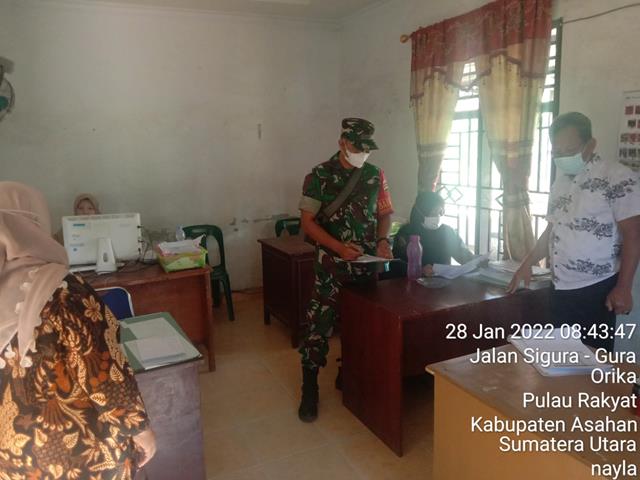 Asahan | Dalam rangka memperbaharui data Geo, Demo, Konsos di wilayah biaanya, sekaligus menjalin silaturahmi dengan Perangkat Desa dan Masyarakat binaan, dalam hal ini seperti halnya yang dilakukan Personel Bintara Pembina Desa (Babinsa) Koramil 16/Pulau Rakyat jajaran Kodim 0208/Asahan Serda Nampati Tarigan turun kewilayah desa binaan untuk melaksanakan kegiatan Komunikasi Sosial (Komsos) bersama dengan Perangkat desa dan masyarakat yang ada diwialayah binaan dalam rangka Puldatater sekaligus Koordinasi untuk menghimbau Masyarakat Desa Binaan yang belum melaksanakan Vaksin, kegiatan tersebut yang dilaksanakan bertempat di Dusun 2 Desa Orika Kecamatan Pulau Rakyat Kabupaten Asahan, Jumat (28/01/2022).